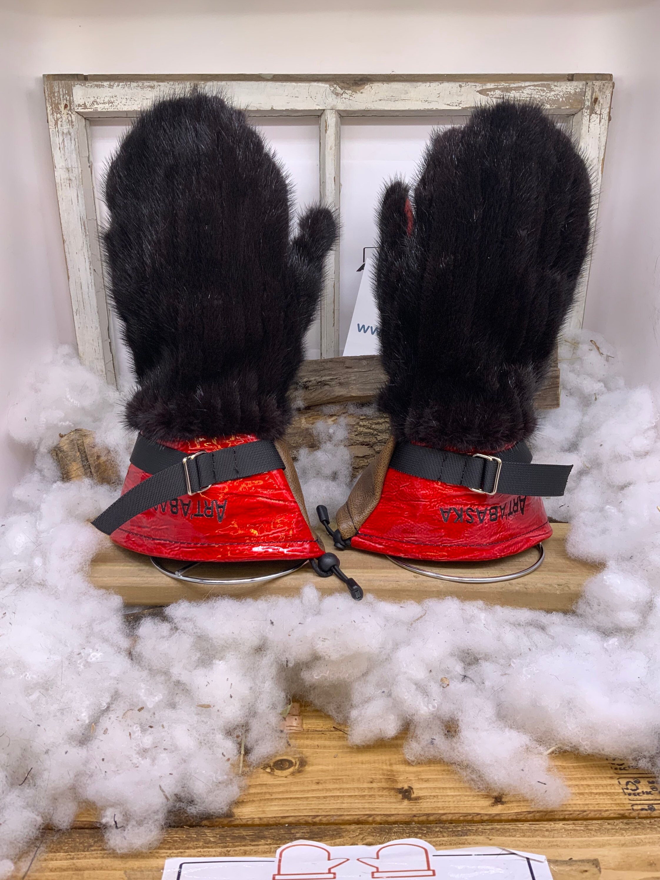 XL mittens in recycled brown mink and shiny antique red leather, with removable fleece felt interior, handmade, unique piece from Quebec 🤎🖤❤️