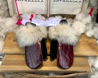 Natural mink & Italian leather winter mittens in red and black | Handmade recycled fur mittens in Quebec | Alice X-Large model